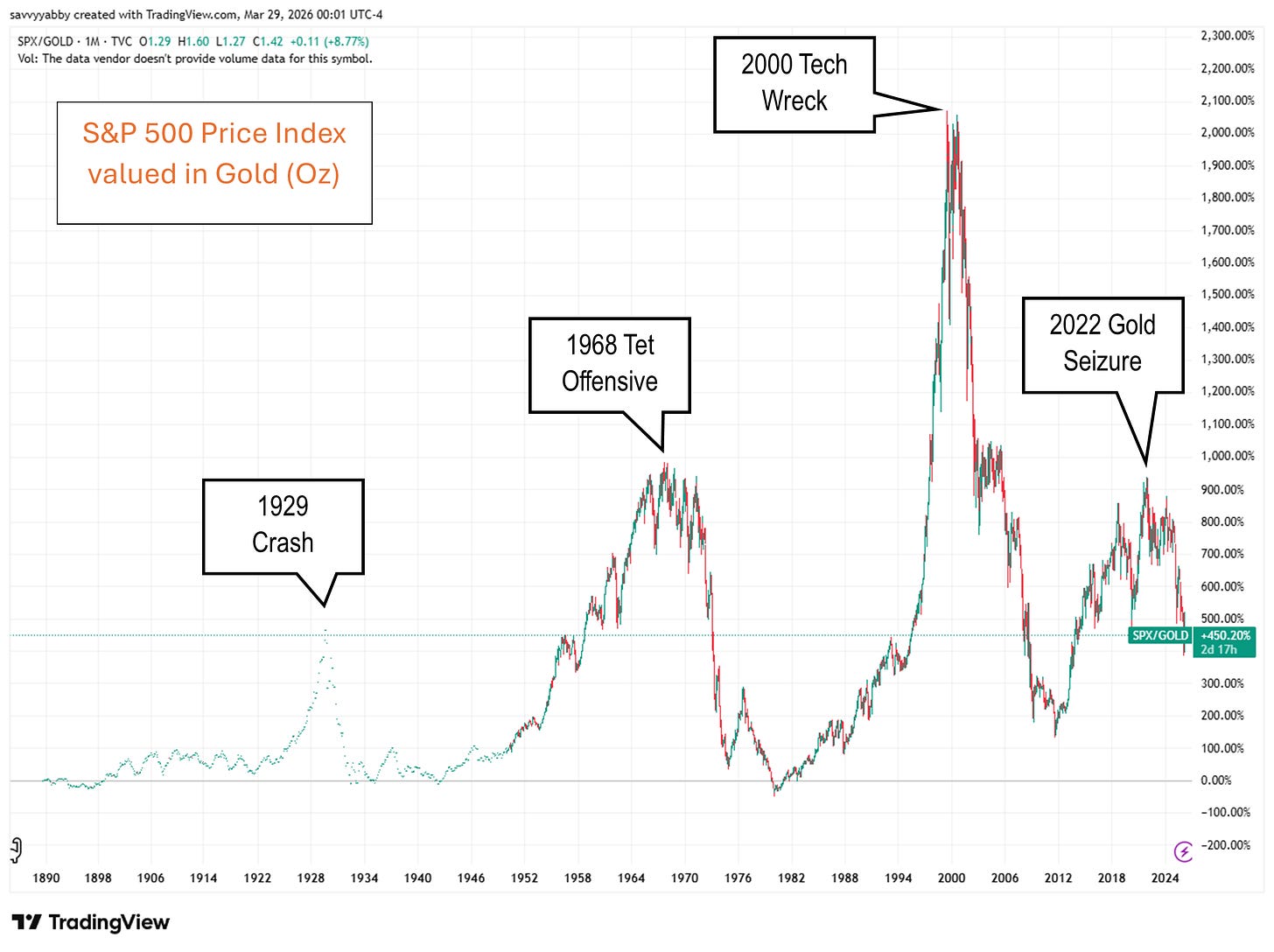 One version which is easy to display is the S&P 500 Index, normally a price level in dollars, remeasured in the value of gold as $/oz. This index is in ounces of gold.
