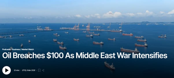 Oil has berached $100 USD per barrel as the Middle East War Intensifies. I discuss the impact with Shazana Mohktar and Wong Shou Ning.