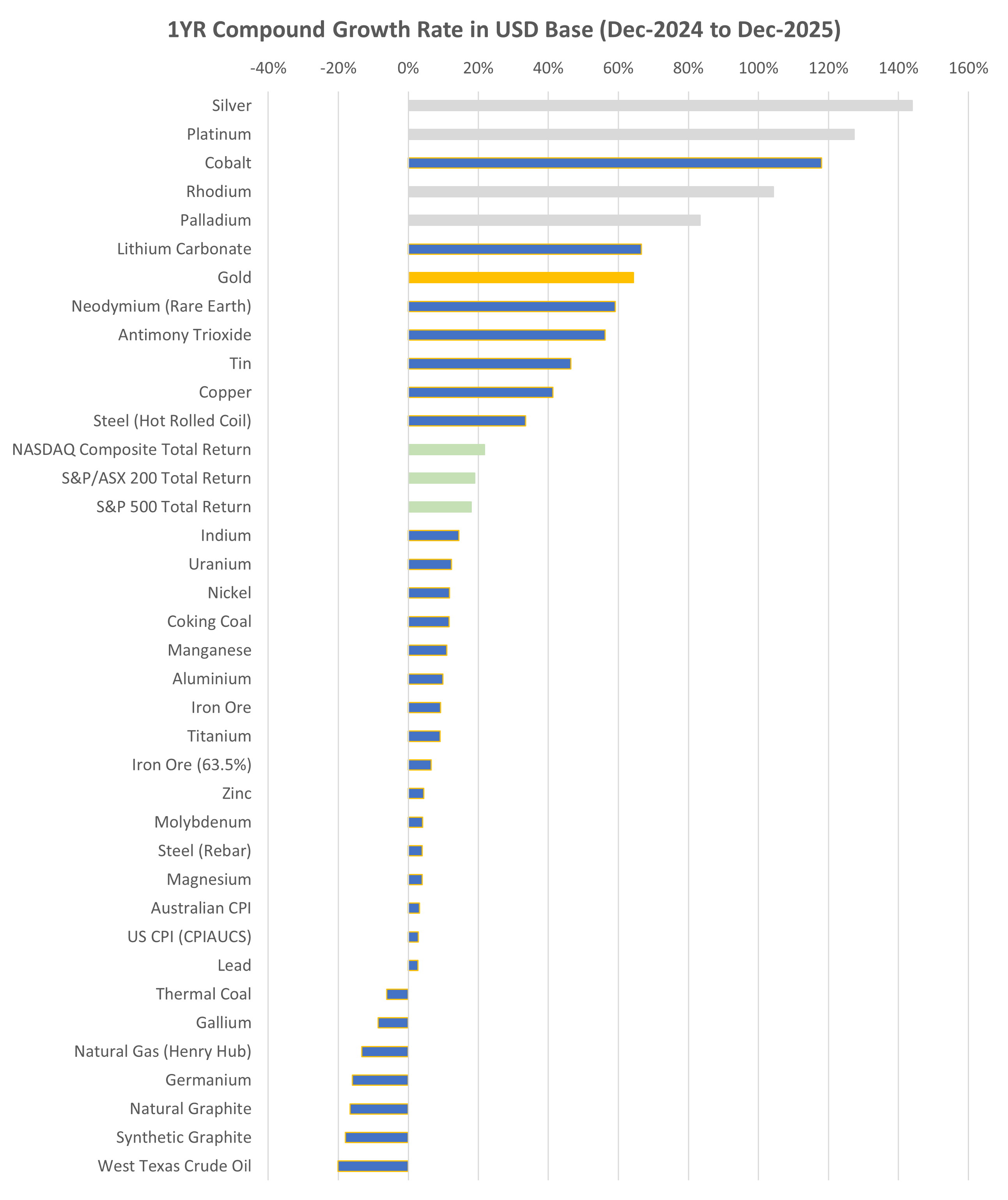The continued geopolitical chaos combined with excess liquidity is likely to drive a group of metals higher in 2026. We like precious metals, copper, antimony and aerospace metals.