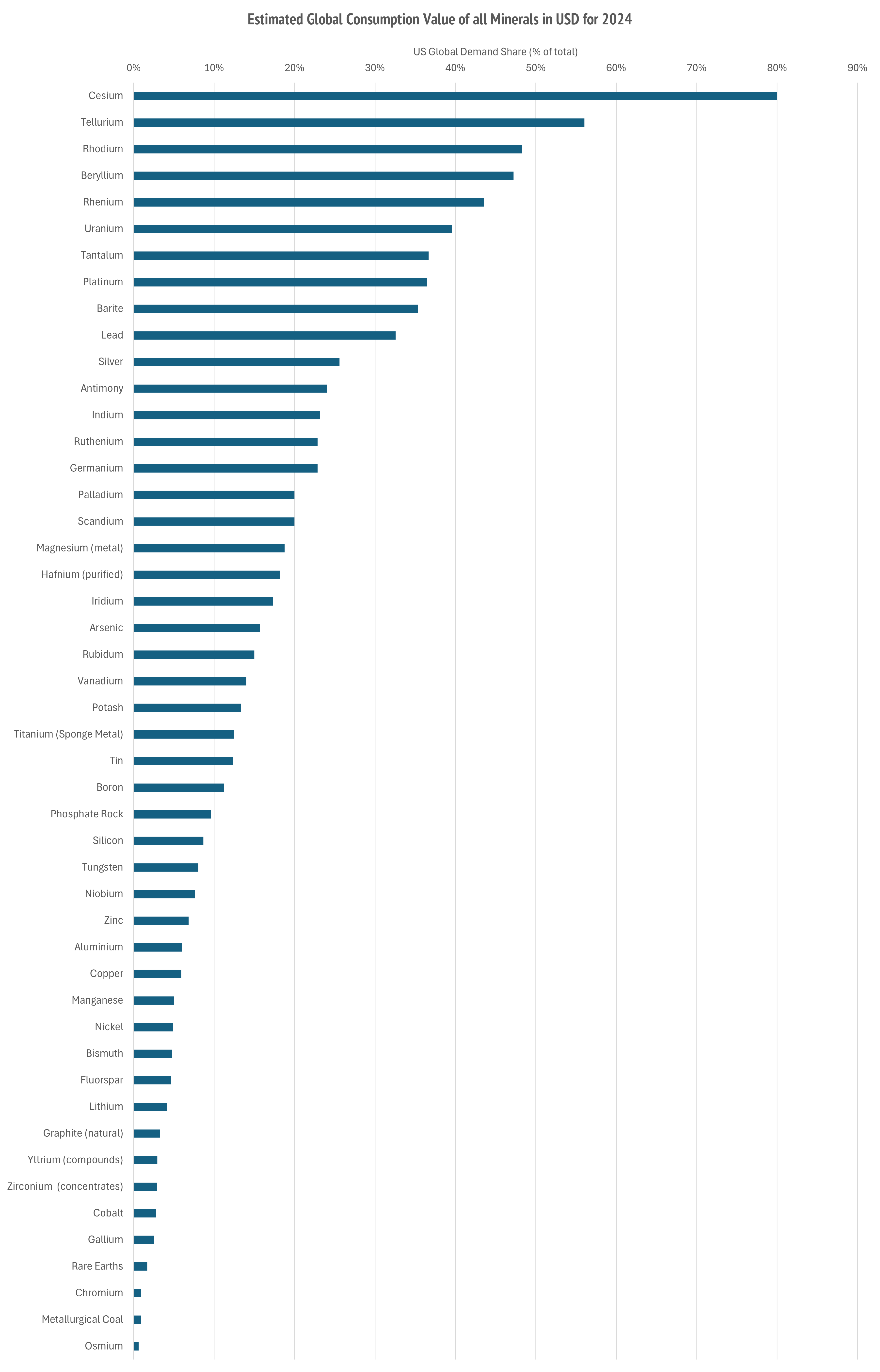 The majority of metals with major global markets, such as Rare Earths, are not really large global share markets for anybody selling to the USA. If you were in the USA hoping to import replace those metals good luck as domestic demand is small.