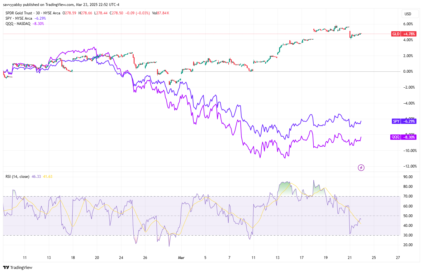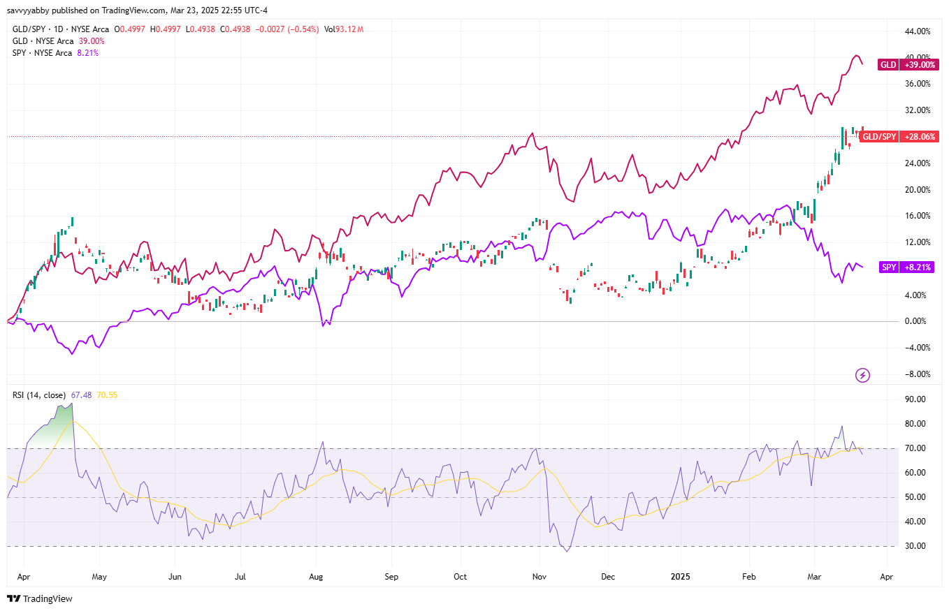 It is a busy chart above, but you can see that gold versus the S&P 500 (GLD/SPY) is up 28% over the past year, with gold, GLD, up 39% and the S&P 500, SPY, up 8.2%.