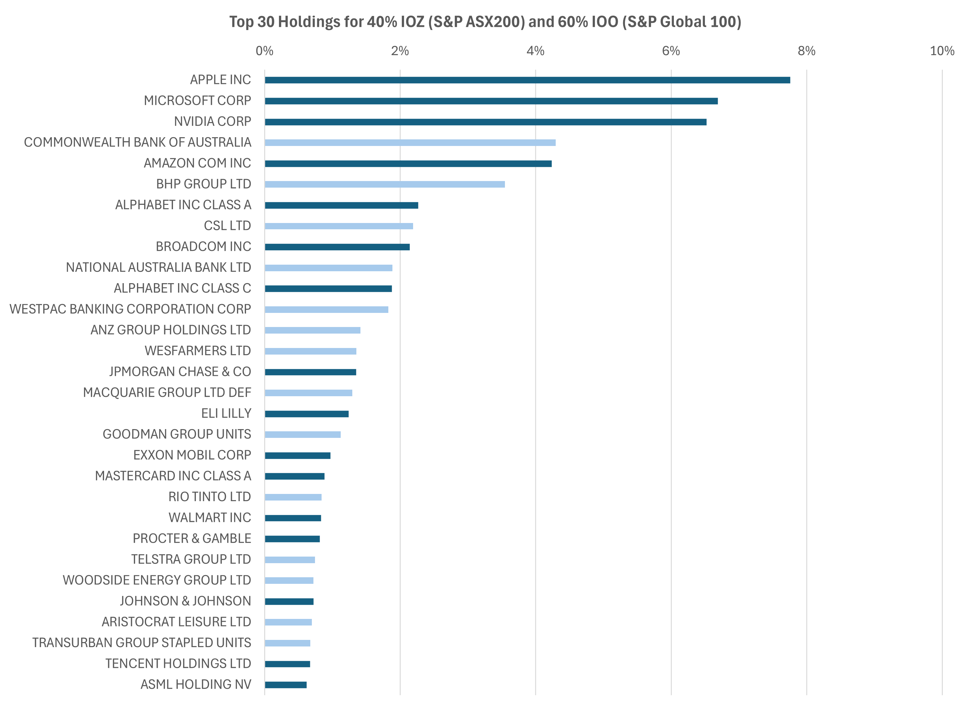 Our KISS portfolio consists of 40% the Australian S&P/ASX 200, via XASX: IOZ, and 60% the S&P Global 100, which is traded as XASX: IOO in Australia. For those who have a US brokerage account, the S&P Global 100 is XNAS: IOO on NASDAQ.
