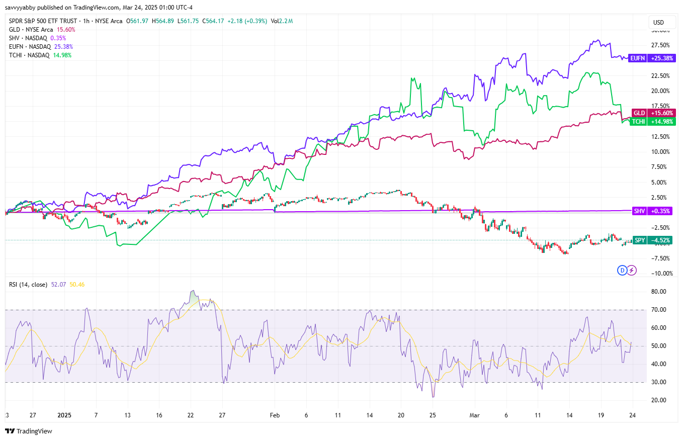 The chart shows the S&P 500, ARCX: SPY (down -4.52%), Short-Term Bills XNAS: SHV, (flat 0.35%, excluding income), gold, ARCX: GLD (up 15.60%), European Financials, XNAS: EUFN (up 25.38%), and China tech XNAS: TCHI (up 14.98%).