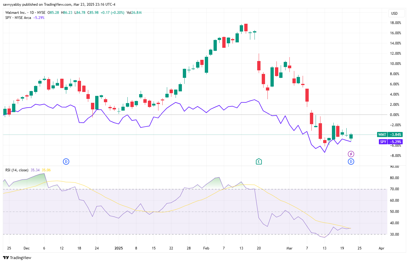 Notice that the story was very positive up until 14-Nov-24. Walmart peaked then, and the S&P 500 peaked a few days later, on 19-Feb-24. For comparison, the AI market darling, NVIDIA XNAS: NVDA, hit an all-time high on 7-Jan-25.