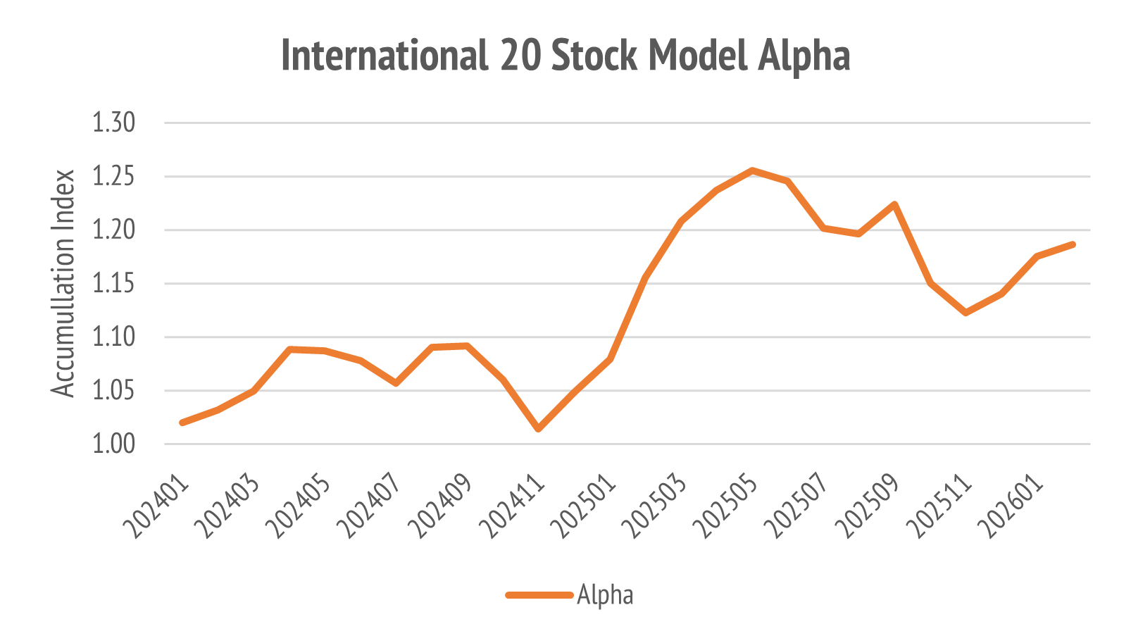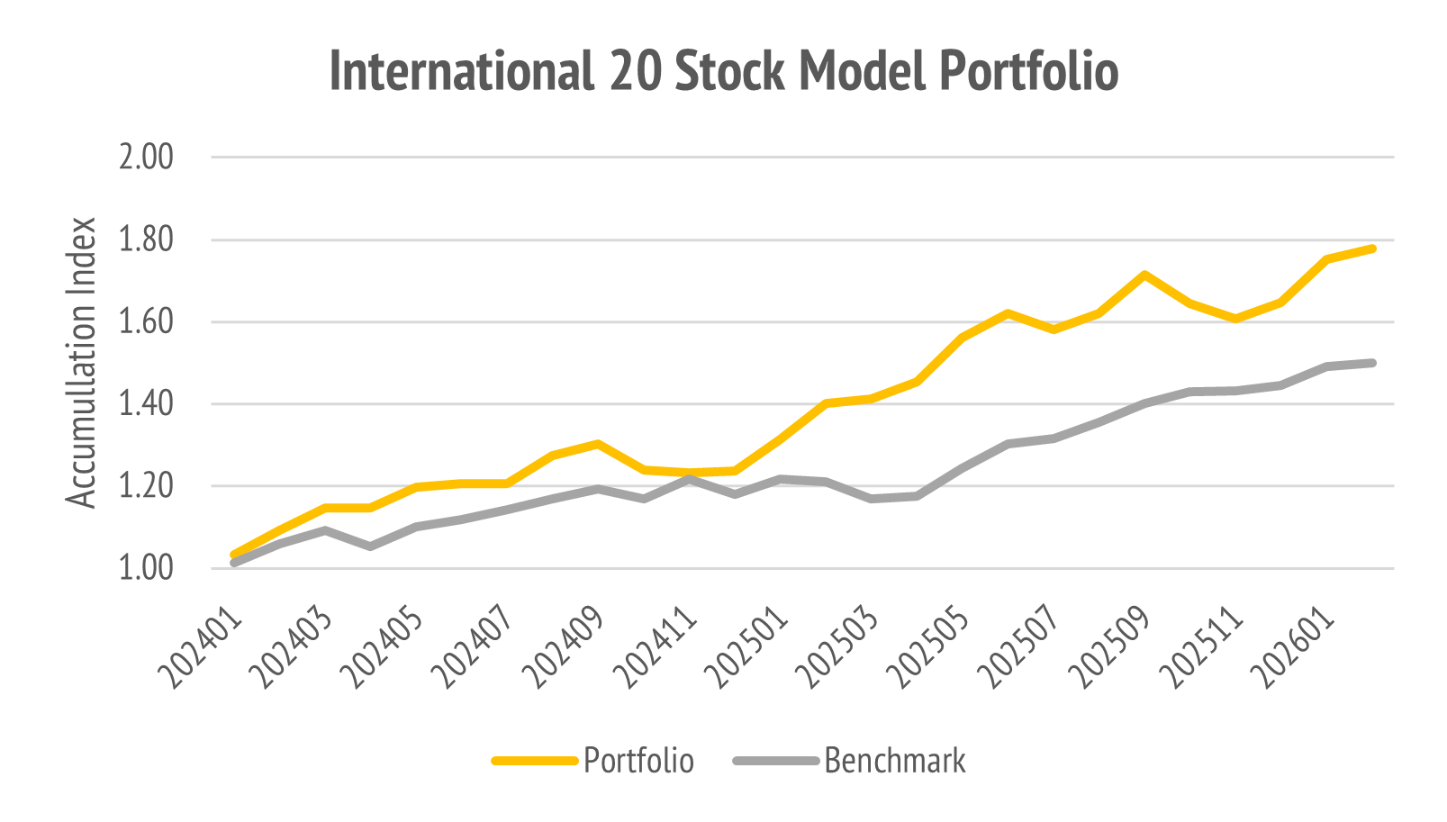 The year opened positively for the benchmark FTSE Global All Cap Index. Through the month the total return of the index was 3.11%. The return for the model was 6.28%, which was 3.17% ahead of the benchmark. These are total returns in USD.