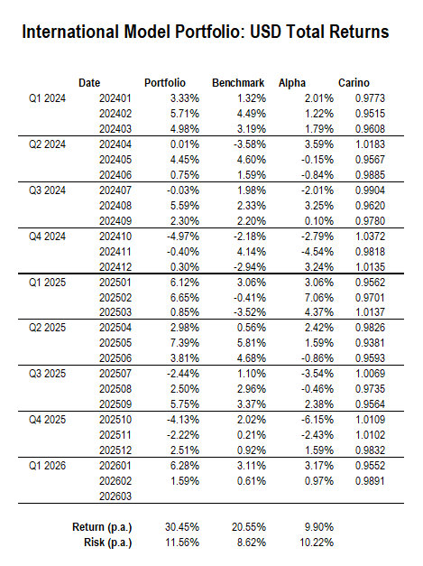 The year opened with a great positive result. The model was up 6.28% and the FTSE Global All Cap 3.11% for a 3.17% alpha. Our positions in defense and resources helped.