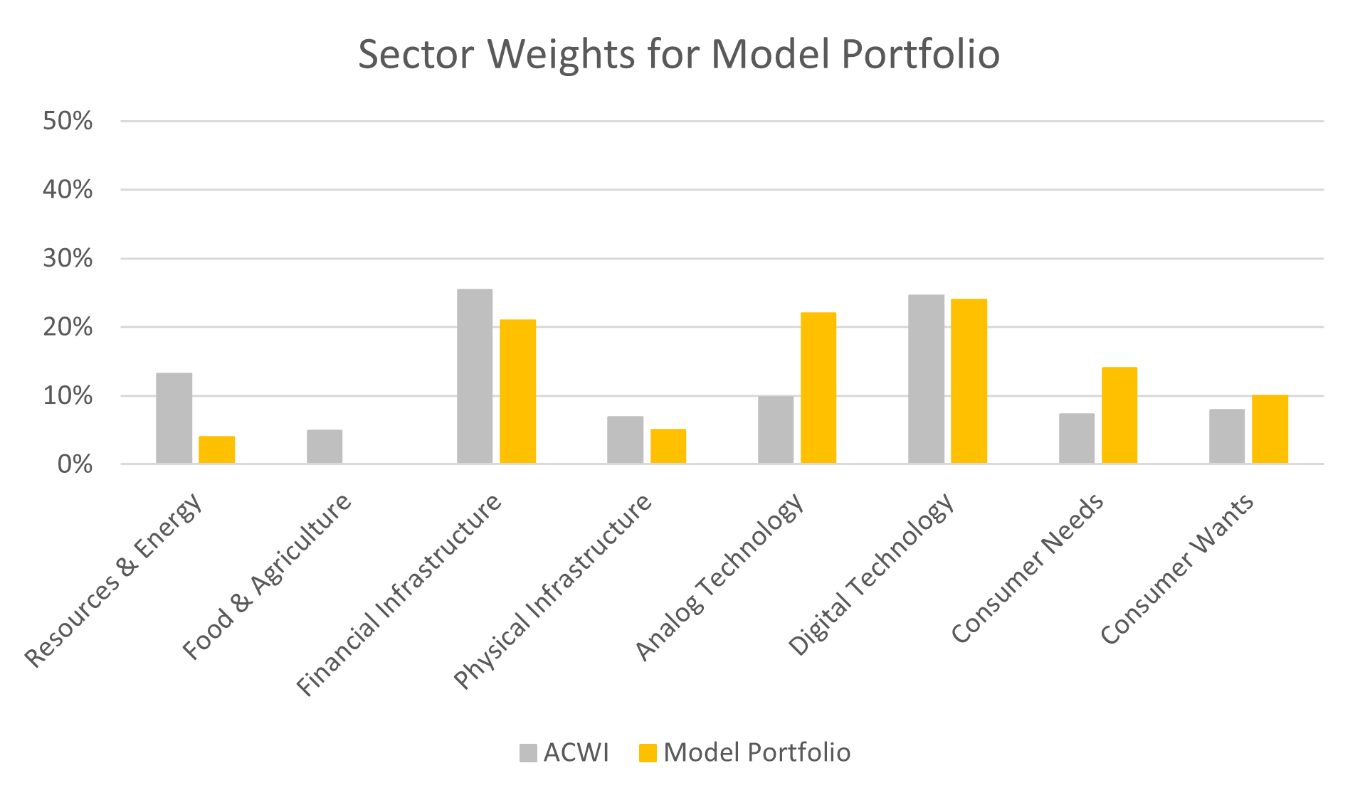 The sector positioning is underweight resources, financial infrastructure, and physical infrastructure, neutral digital technology, with an overweight to analog technology, consumer needs, and consumer wants.