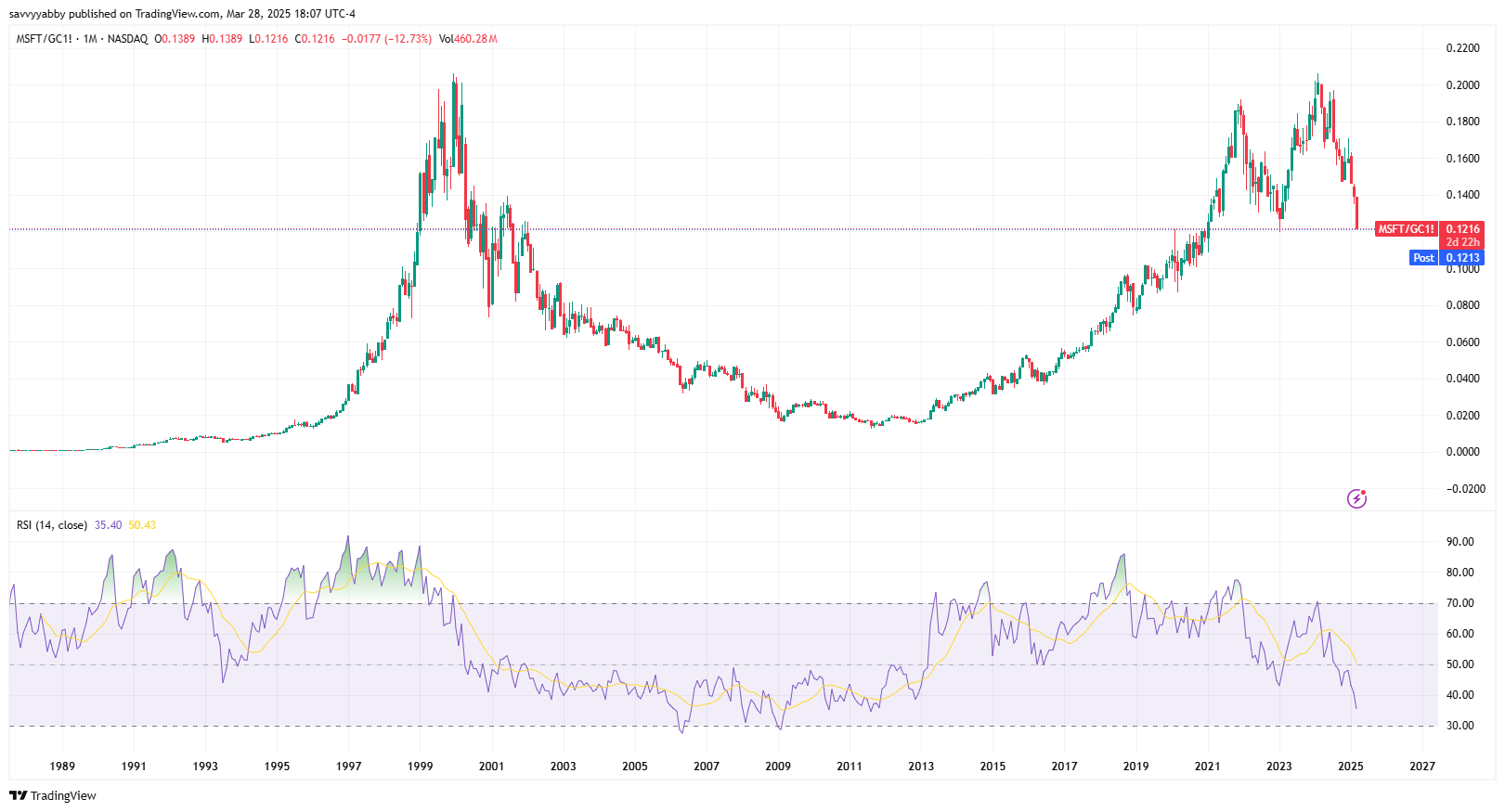 That is because of this chart here, which shows Microsoft stock versus gold.