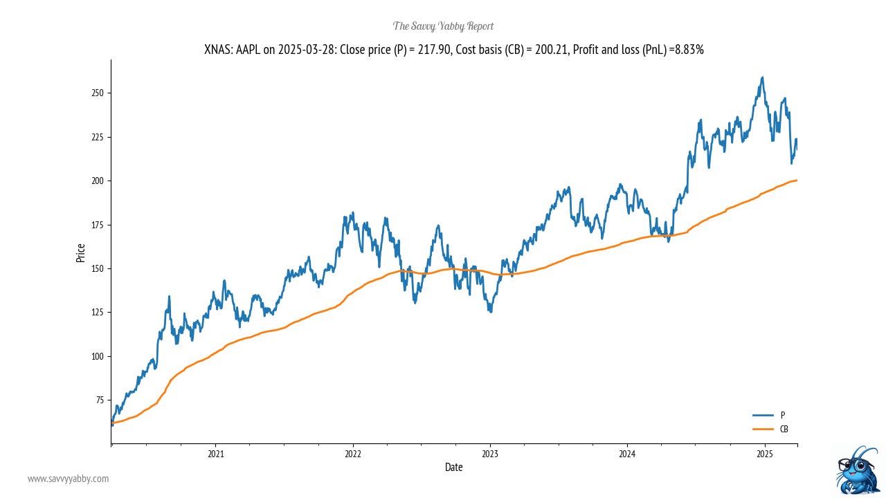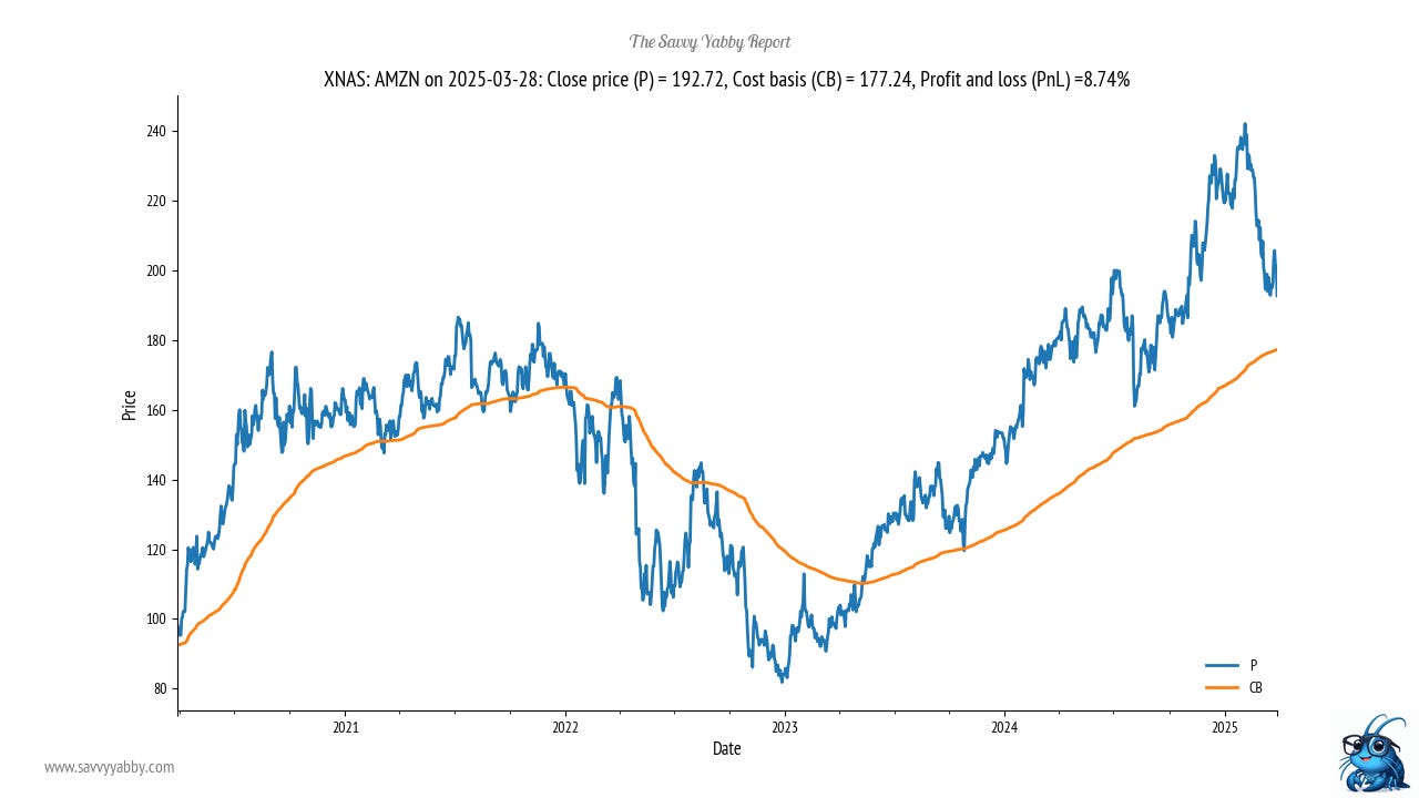 For instance, we also bought shares in Amazon XNAS: AMZN for a split-adjusted price of around $11 USD around the same time and soon sold them for a 15% profit. The closing price on Friday 28-mar-25 was $192.72 USD, or a 17.5x gain foregone.