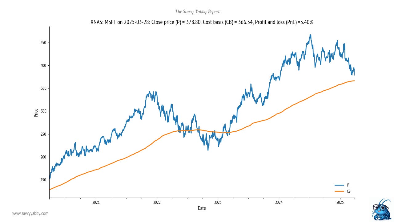 On 7-Jul-2011 we bought Microsoft at a split-adjusted $26.67 USD. The stock closed at $378.80 USD on the 28-Mar-2025. This is a 14.2x gain, excluding dividends.