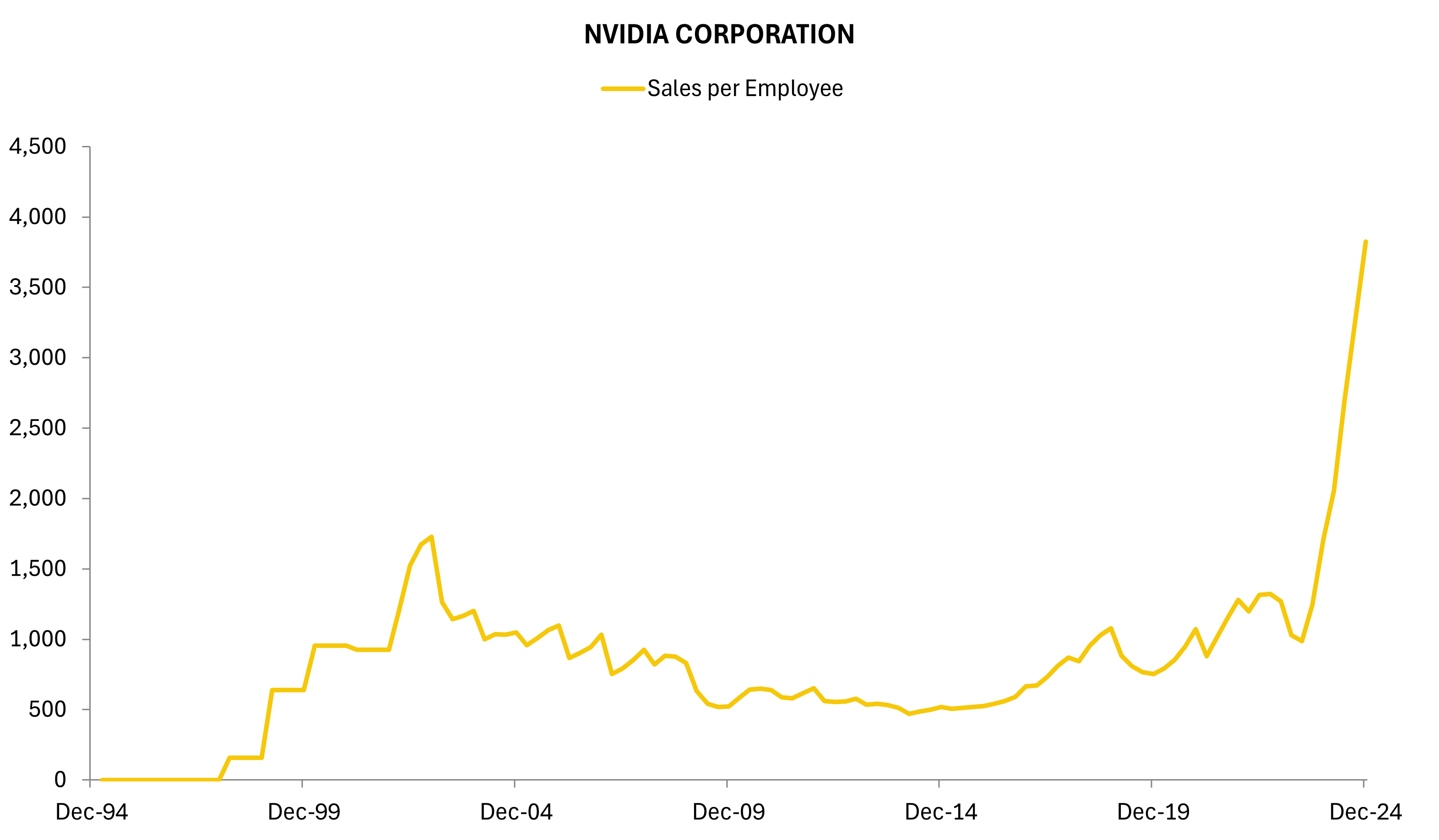 The sales per employee metric is something I look at a lot. Nvidia has expanded their sales by a huge amount without needing to similarly expand their asset base. This is a sign of huge operating leverage to the price-per-unit. That has been high.