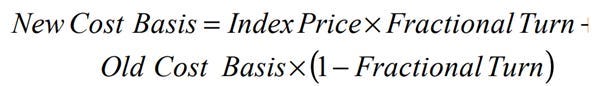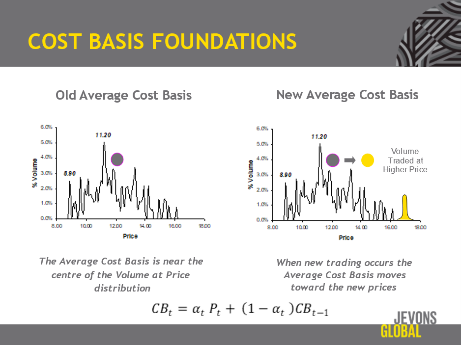 In words, the cost basis indicator is updated by taking the percentage of shares outstanding that were traded in the last session, multiplying that by the price, and then adding that to one minus that percentage for the old cost basis.