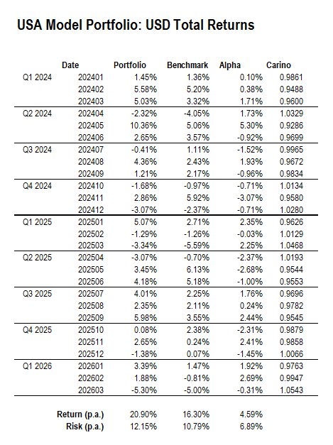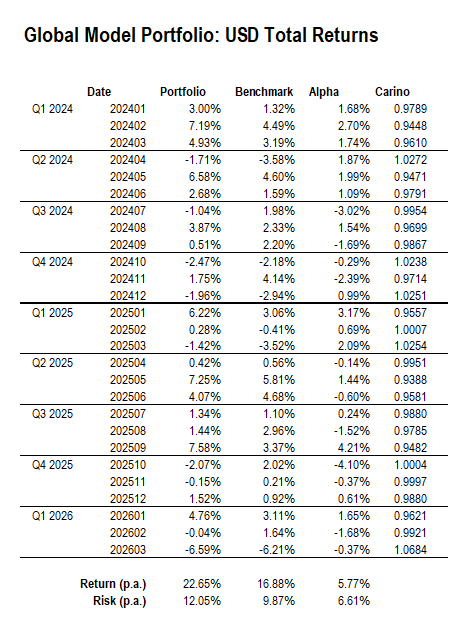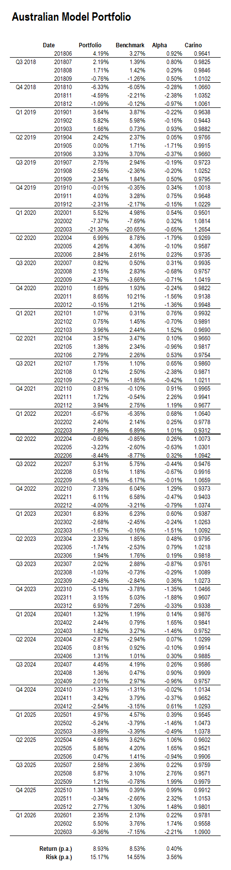 The first quarter to 31-Mar-2026 was negative, due to a large drawdown in March, for both the model portfolio and the benchmark S&P/ASX 200. The Q1 numbers saw our model down -2.13% and the market -1.61% for a net lag of -0.52%. This is down to a string open to the year, followed by a pullback in March.