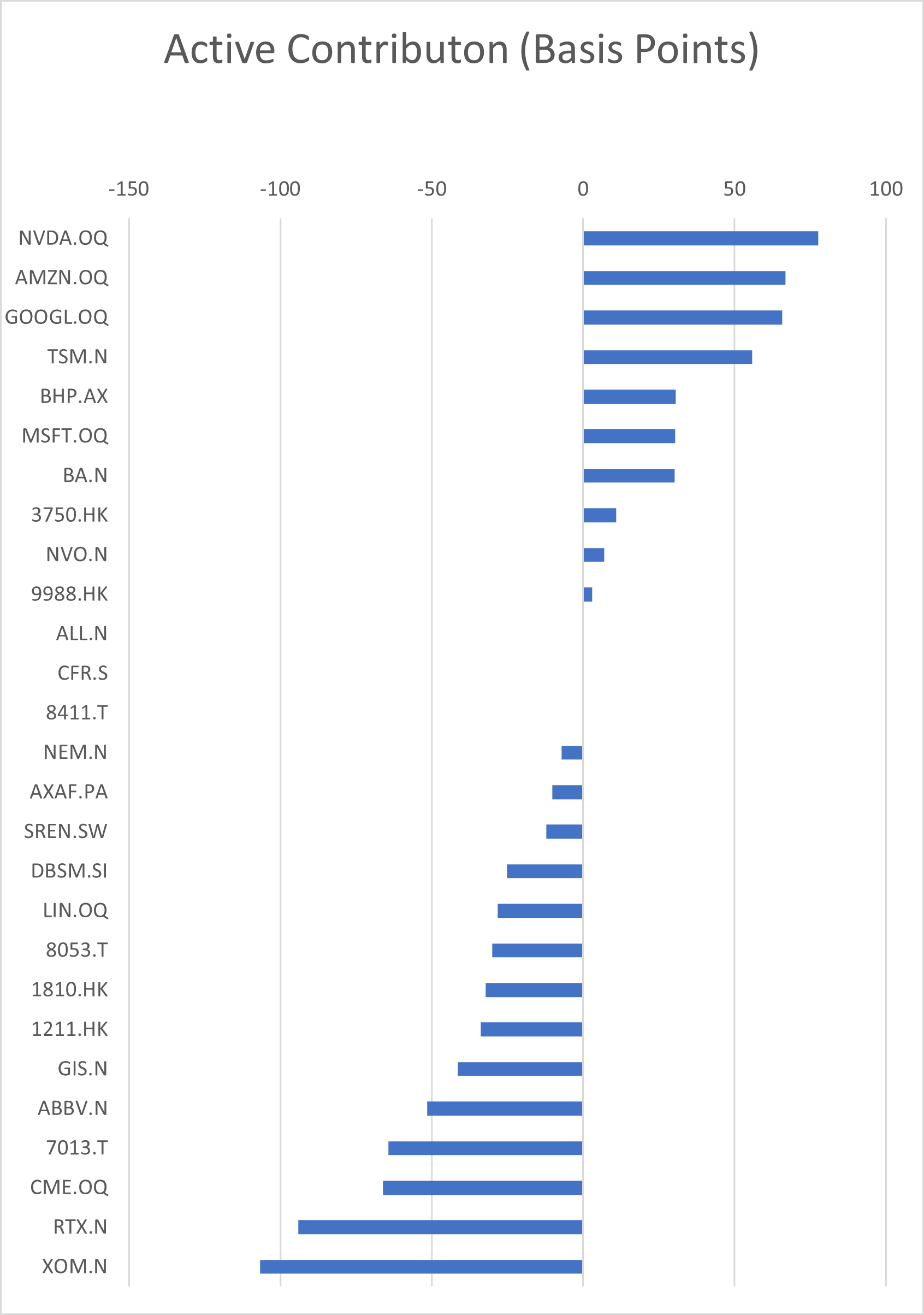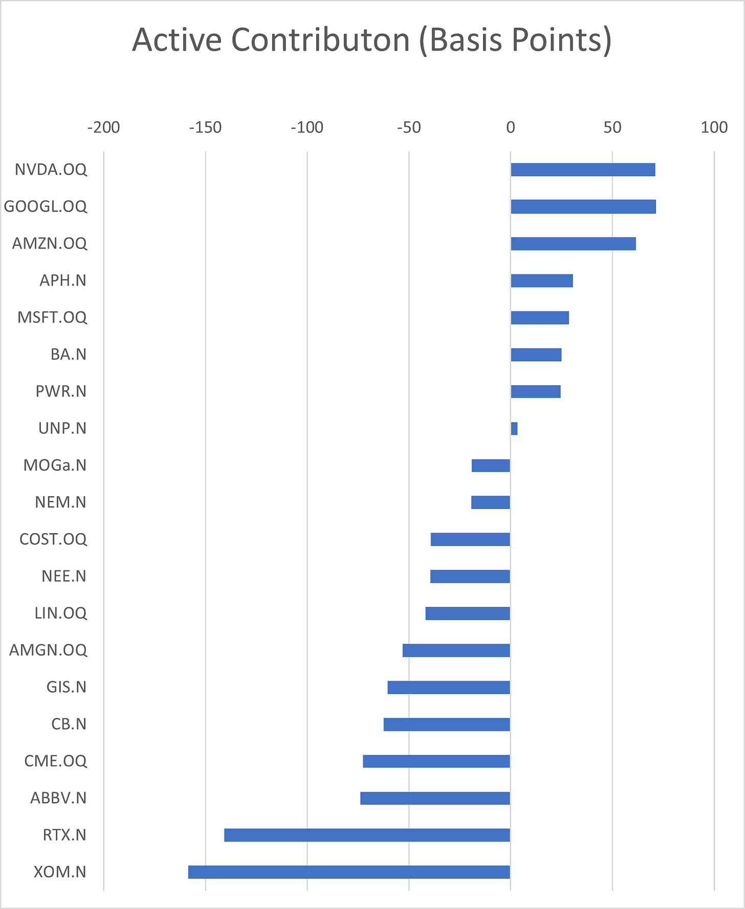 The above contribution chart highlights the swing back to technology names, with the results led by Nvidia XNAS: NVDA, Amazon XNAS: AMZN, Alphabet XNAS: GOOG and Taiwan Semiconductor XNYS: TSM. The key laggards were our geopolitical hedges in Exxon XNYS: XOM and Raytheon XNYS: RTX, along with CME XNYS: CME.