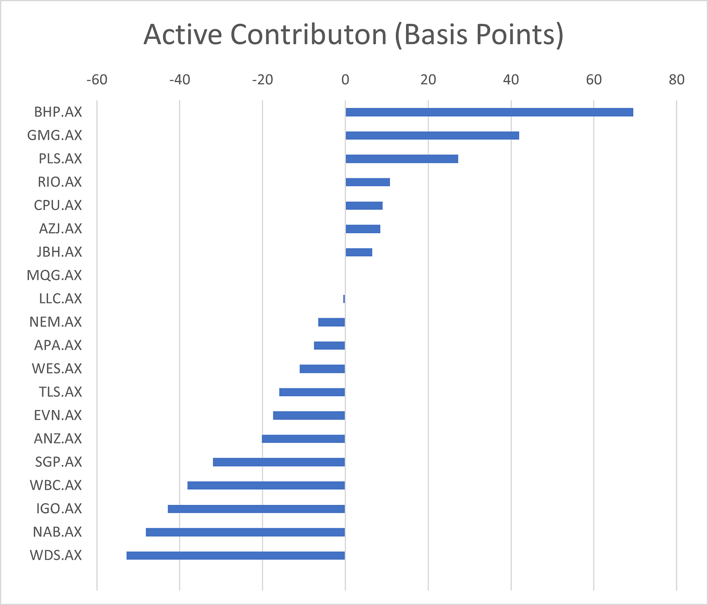 The last rebalance involved an exit in Macquarie Group XASX: MQG and an addition of the gas pipeline company APA Group XASX: APA. There were other minor adjustments to stock weights to adjust them up and down to round numbers for quarter end.