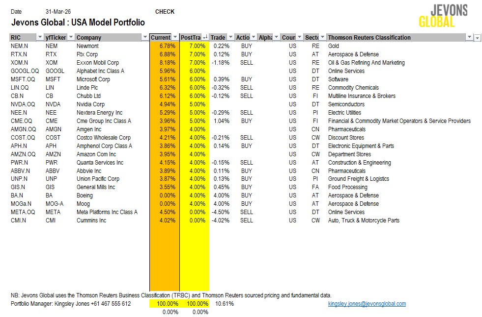The 31-Mar-2026 rebalance saw us exit positions in Meta Platforms XNAS: META and Cummins XNYS: CMI, to add Boeing XNYS: BA, and Moog XNYS: MOG.A. The capital expenditure boom in the USA is likely to widen into defense aerospace, due to the planned 50% increase in the Pentagon forward budget for 2027.