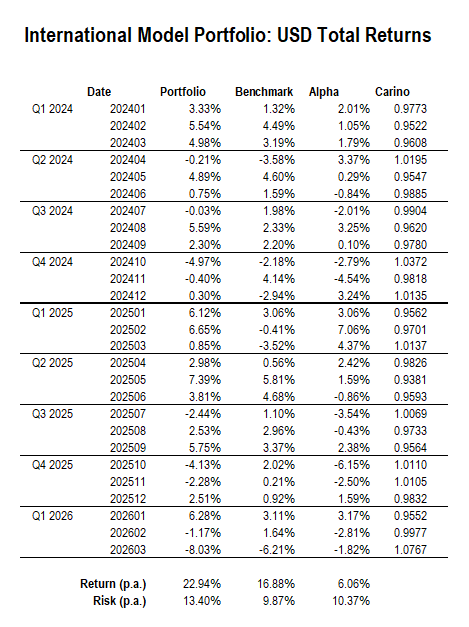 The performance in Mar-2026 mirrored that of the international model. We were down -6.59%, a modest -0.37% behind the FTSE benchmark at -6.21%.