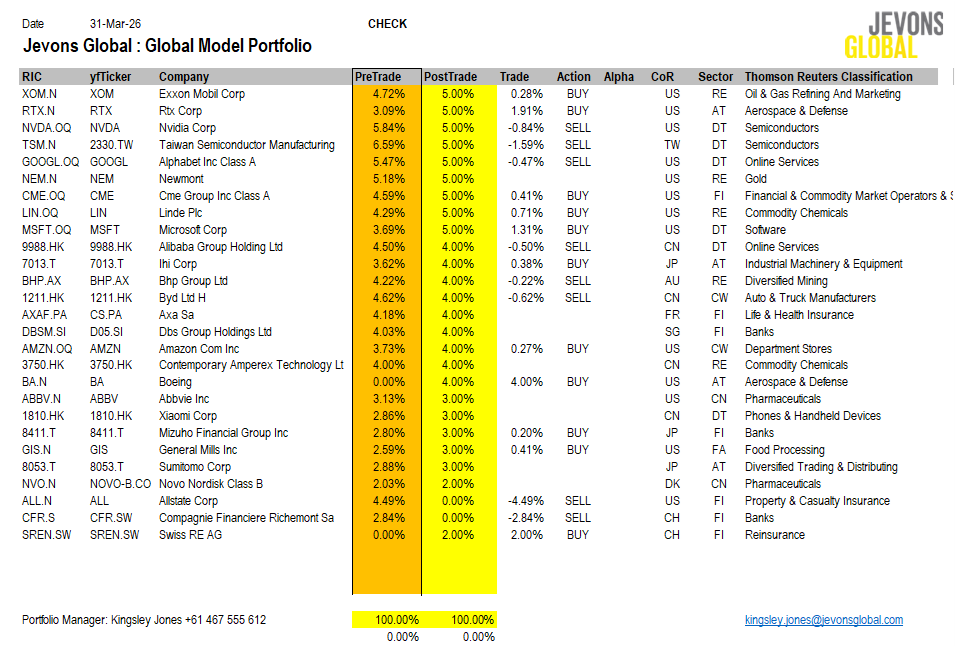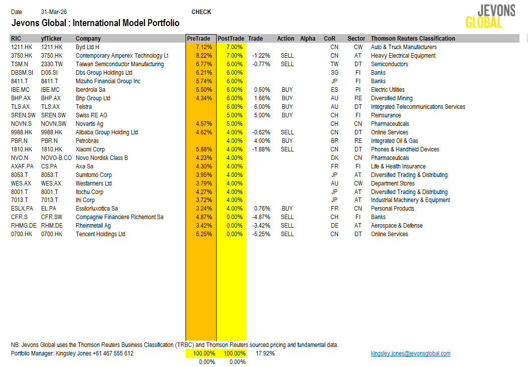 Rheinmetall had performed very well for us since inception, but we have tilted to US and Japanese defense exposures as the German story is fully priced. The other moves are to shore up some yield in strong currencies, like the Swiss Franc, and to fill out an energy tilt in the international model via Petrobras. We already have exposure to the offsetting Electric Vehicle thematic via BYD XHKG: 1211.HK and CATL XKHG: 3750.HK, plus Xiaomi XKHG: 1810.HK. The war on Iran has lifted all boats in alternative energy but also benefits those oil and gas producers outside of the Persian Gulf. Telstra is a likely beneficiary of the multi-year trend for AI-related telco services.