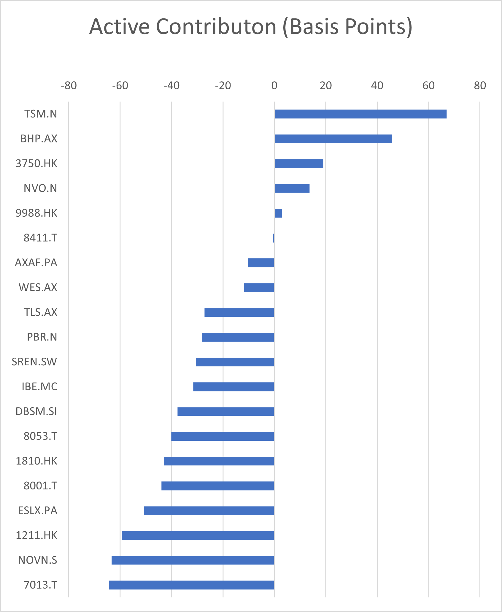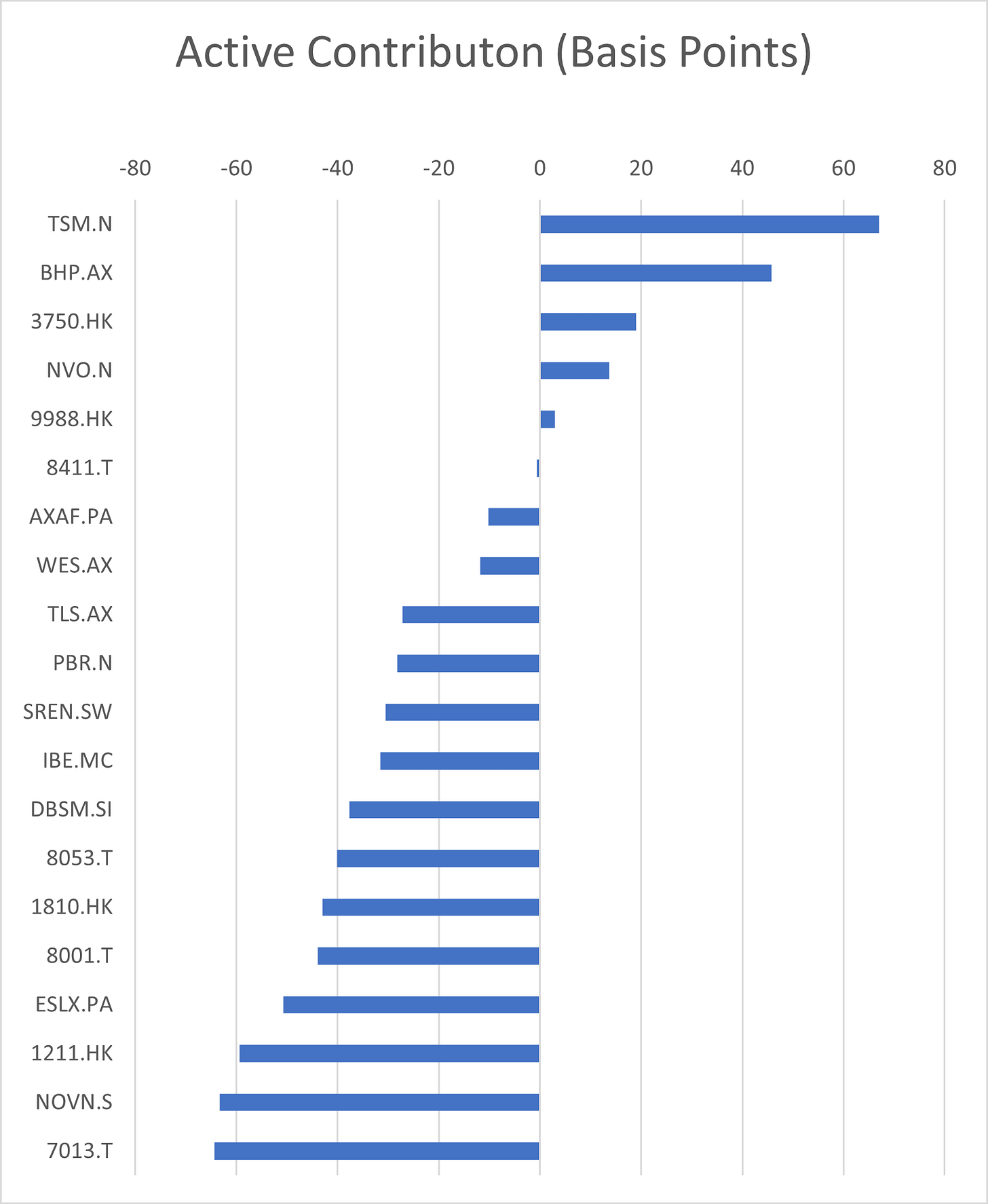 The rebound MTD was modest at +4.74%, behind the FTSE benchmark at +8.68%, for a negative lag of -3.94%. The key driver of this was US technology stocks which we do not own in this non-USA focused strategy. Note that the top performer was Taiwan Semiconductor XNYS: TSM, our second-largest position after CATL XHKG: 3750.HK.