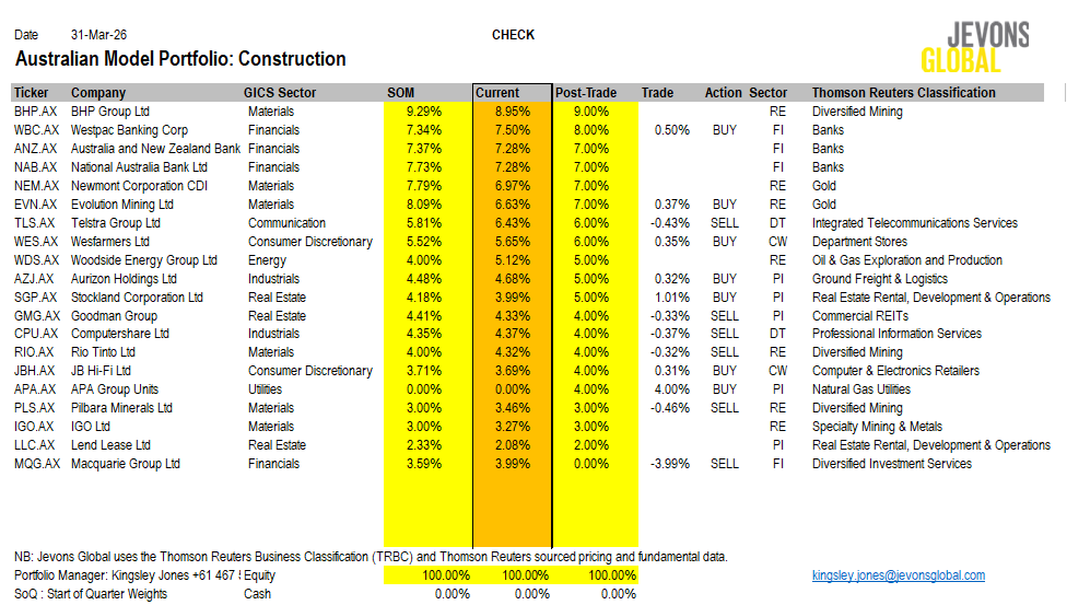 No further changes are contemplated at this stage. The markets are too volatile for any high conviction moves other than the increased weight to energy stocks via the addition of Woodside Energy XASX: WDS, on 3-Mar-2026, and APA Group.