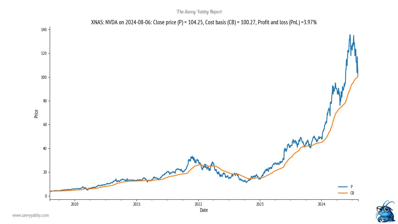 You can see that Nvidia has had one profit-taking correction already, and now seems to be turning at around break-even. While the descent is scary, the point to consider buying is where that falling knife meets resistance at cost basis.