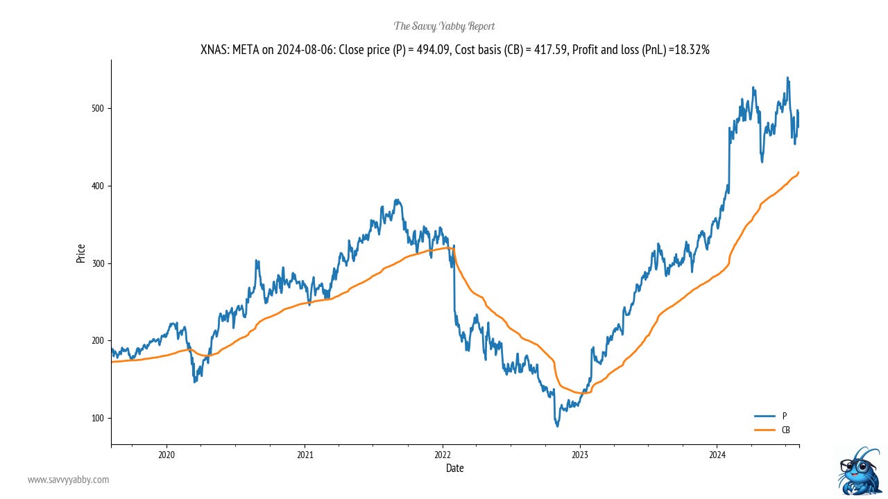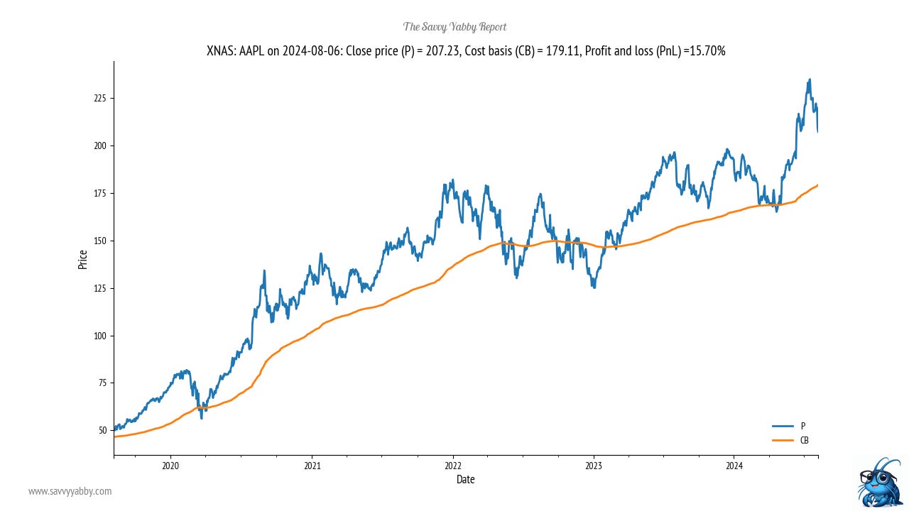 However, first let us review the basic form of the charts we use. In the example below, the blue line is the closing price for the stock, and the orange line is the cost basis.
