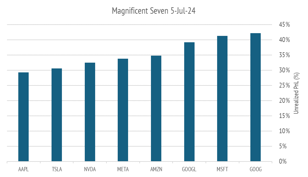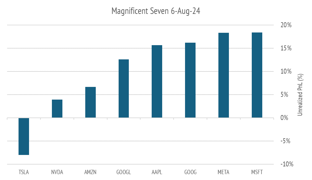 The profit and loss indicator above makes this process much clearer as I will illustrate with the Magnificent Seven. For comparison, see our post "Where is the value in US technology”, that I published about a month ago. One month ago, the unrealized profit and loss chart for the Mag-Seven was healthy.