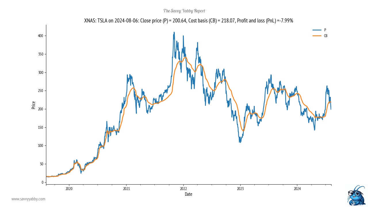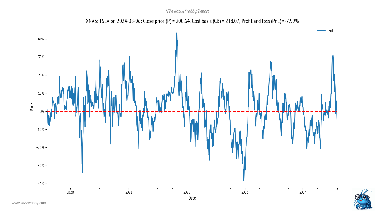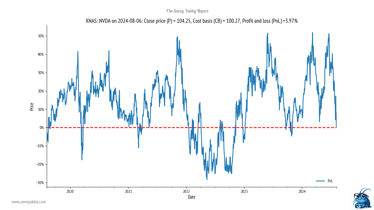This is made much clearer when we look at the profit-and-loss chart, which is formed by dividing the closing price by the cost-basis to get a percentage profit, or loss.