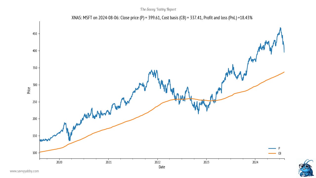 Microsoft XNAS: MSFT has had a relatively sedate correction. Notice that the cost basis is still a long way below the current price. There is no great stress here, and investors are likely looking for a turn at the first quarter lows.