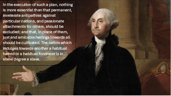 In the tense geopolitical cauldron of our time, where positive efforts to encourage trade, prosperity, and productive diplomacy, are shunned, I firmly adhere to that viewpoint espoused by George Washington in his farewell address.