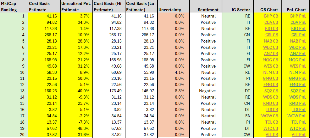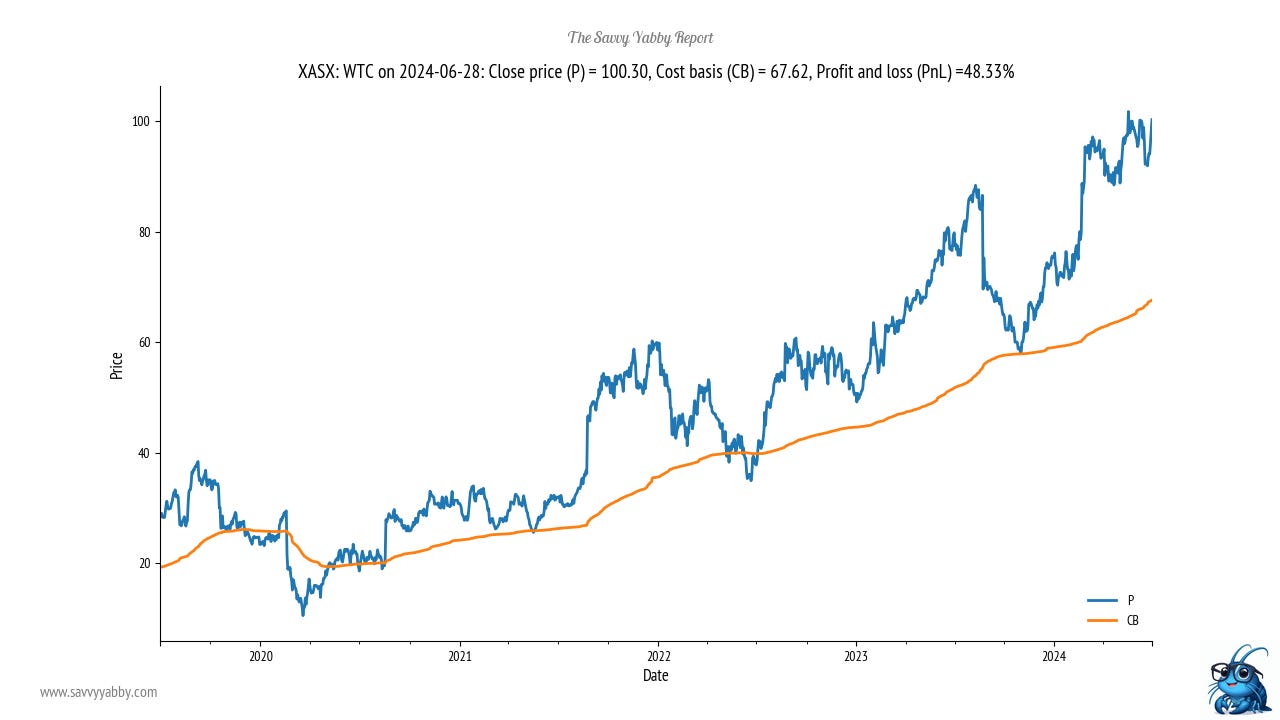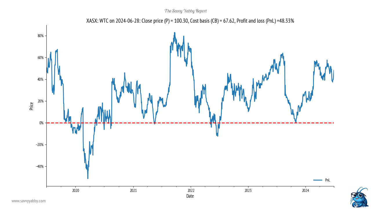 Wisetech Global ASX: WTC had a sharp test of cost basis support in late 2023 and has now fully recovered. The stock looks set to make new highs, although it may be a bit overbought at this time. This is a good candidate for watching the PnL signal.