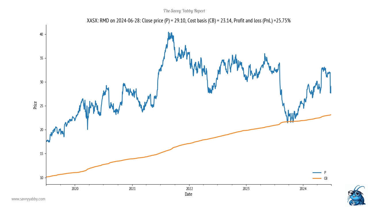 Resmed ASX: RMD had a big test of cost basis late last year during the Ozempic scare that weight loss drugs might cruel the Sleep Apnea devices market. That fear has now resurfaced, but the cost basis support level is now higher at $23.14.