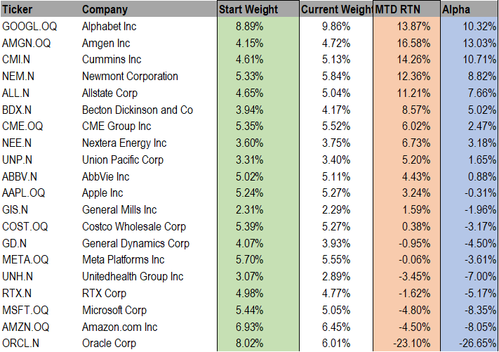 Note that Alphabet is the largest position at 9.86%. The Start Weight of Nov-2025 was lower at 8.89%. The MTD Rtn column shows the total return during the month.