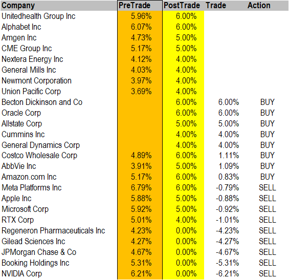 Where the position change is less that 0.50%, we do not represent it is a BUY or SELL but simply a rounding back to whole number target weights. The larger changes are intentional changes to adjust overall portfolio weights. Some are large, like the new positions entered, and the olds ones exited. Others balance the risk exposure.
