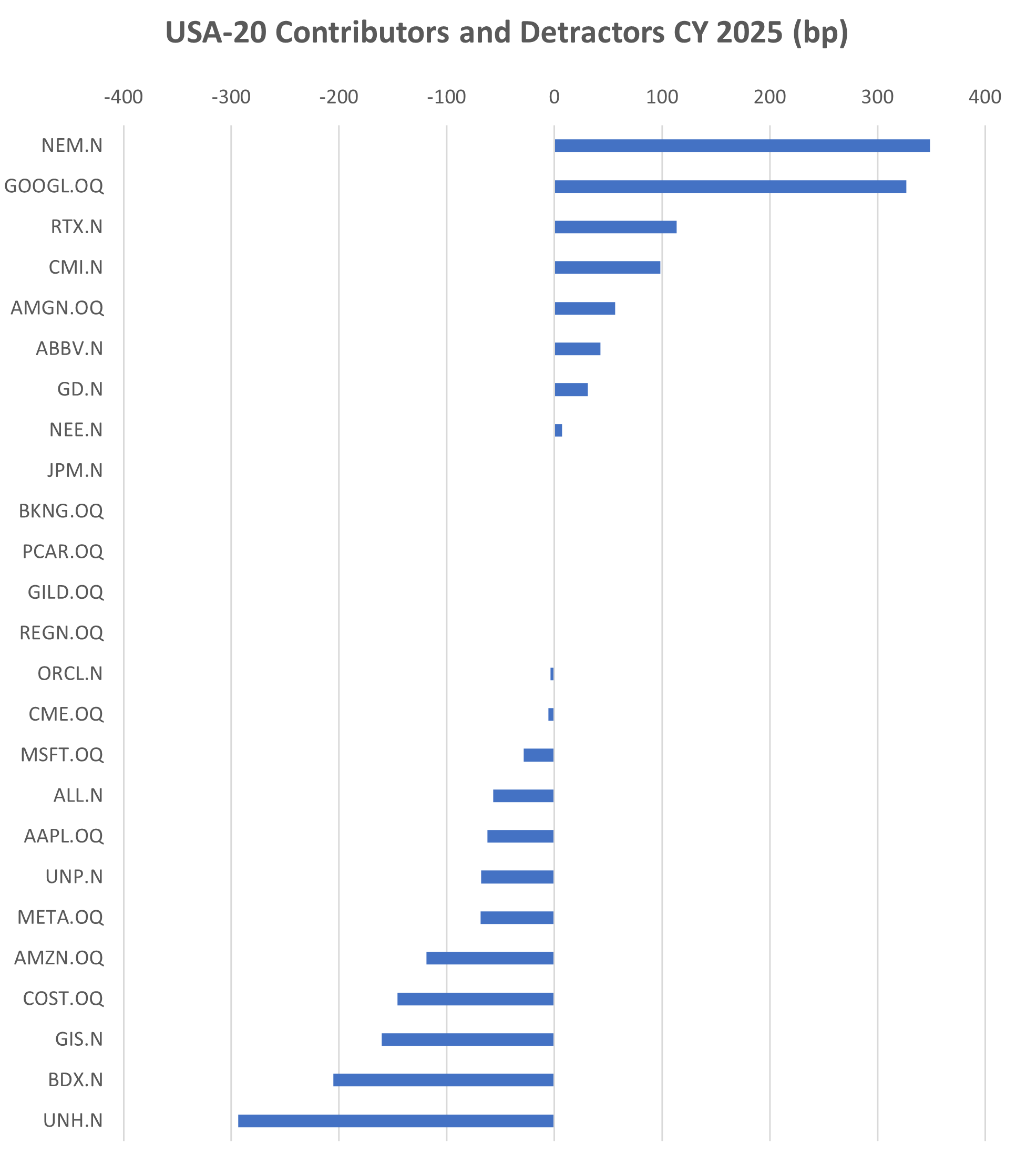 Evidently, gold miner Newmont (XNYS: NEM), tech major Alphabet (XNAS: GOOG), and defense contractor RTX (XNYS: RTX), were the biggest positive contributors.