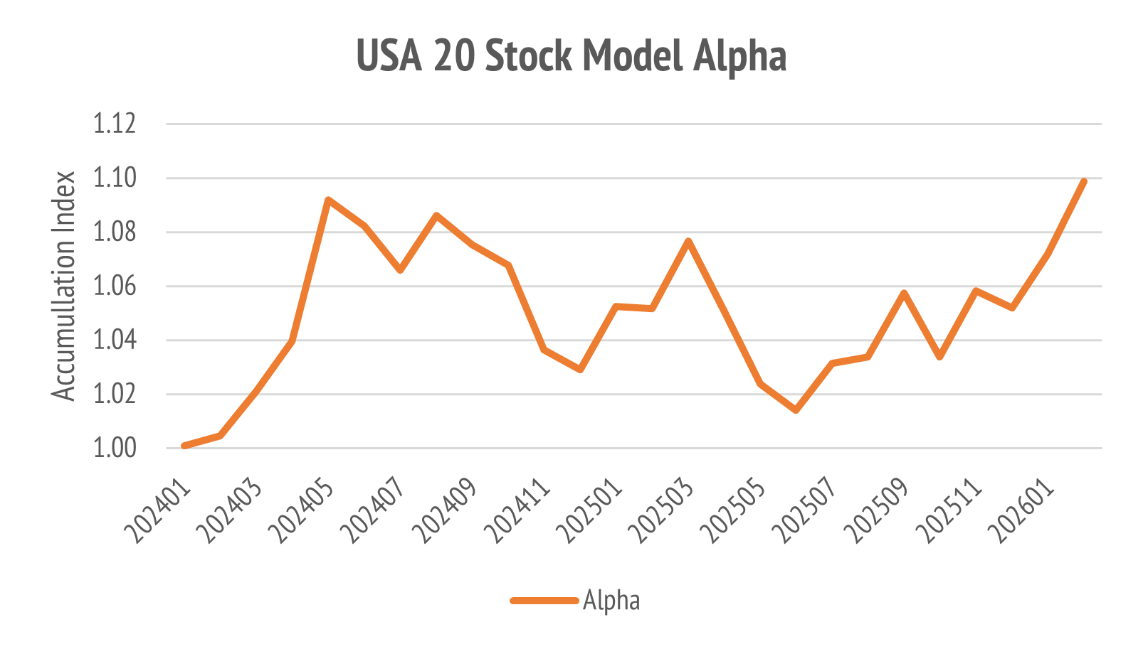 The year opened positively for the benchmark S&P 500. Through the month the total return of the index was 1.47%. The return for the model was 3.39%, which was 1.92% ahead of the benchmark. These are total returns in USD.
