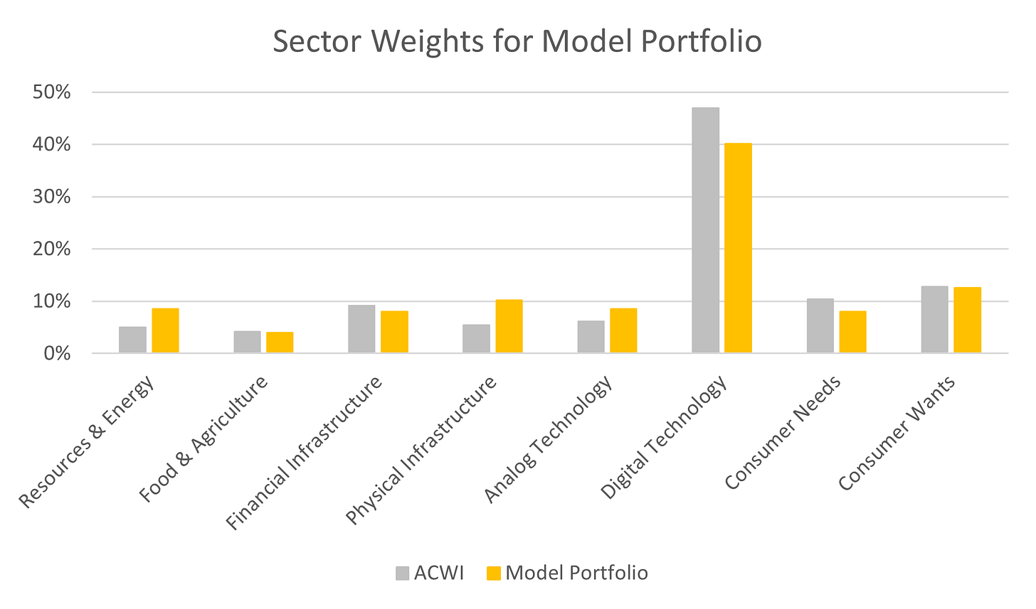 The sector positioning is overweight resources, physical infrastructure, and analog technology, paid for with a clear underweight to digital technology.
