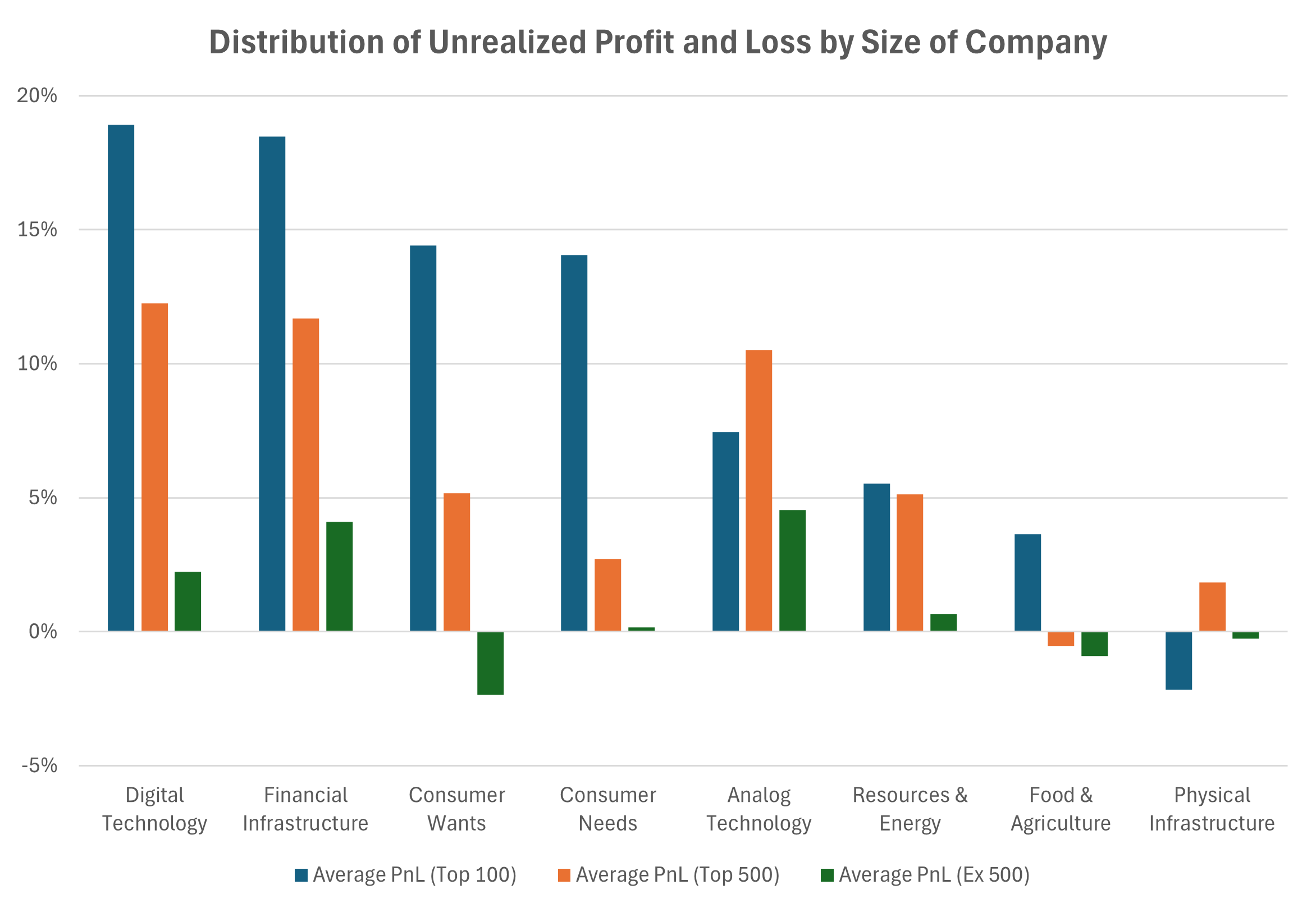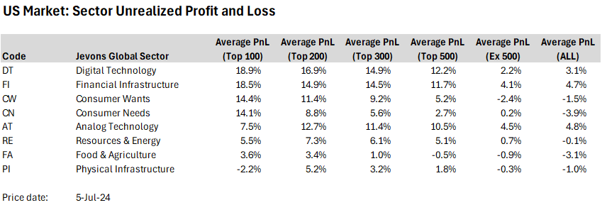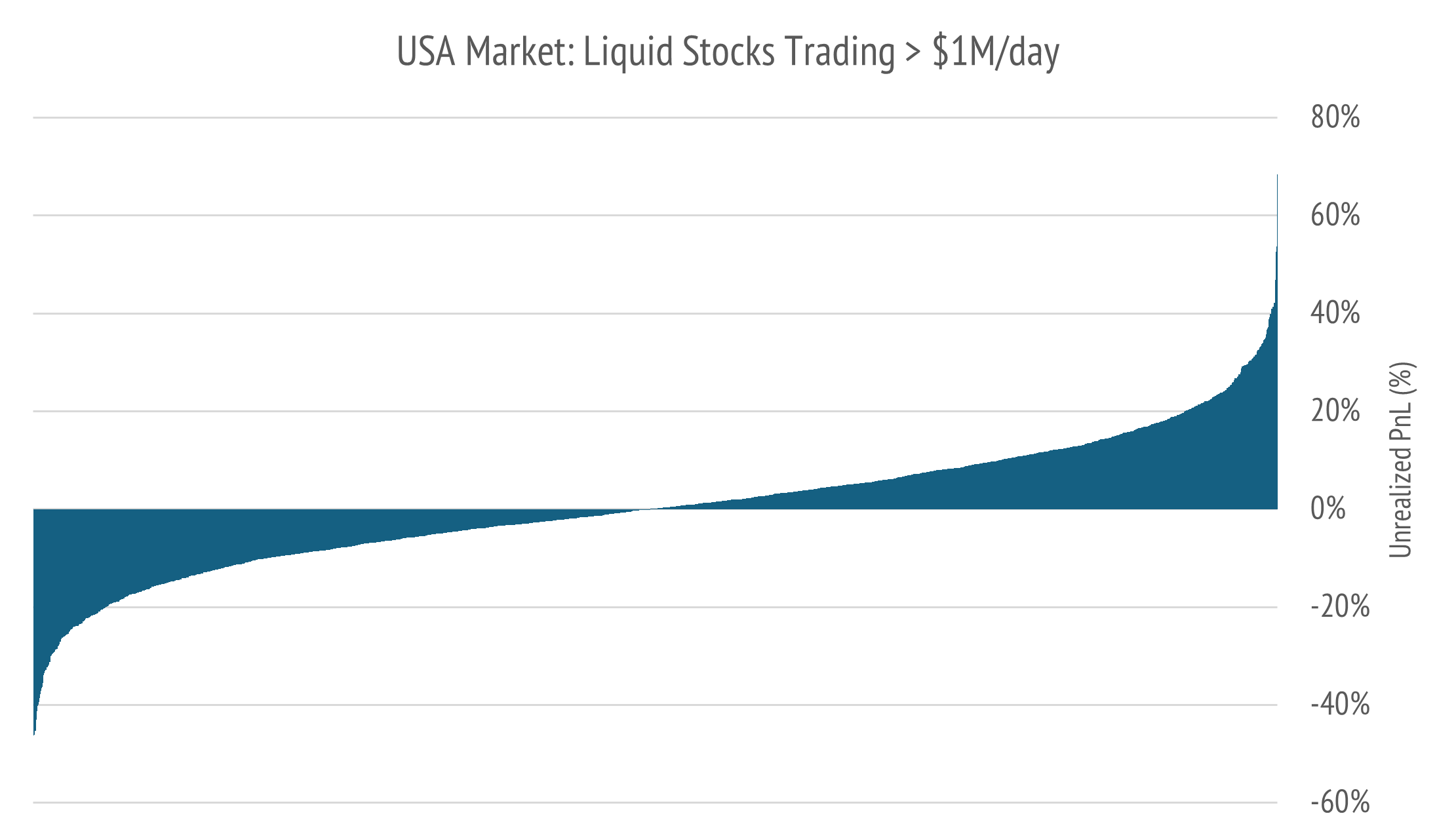 Across the US market, we calculated the unrealized profit and loss for all stocks that traded and average of $1M USD/day. This liquidity screen improves the reliability of our estimates and narrows the focus to the more significant companies.