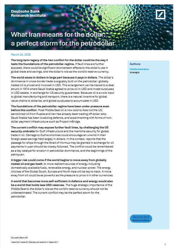 For a timely discussion of this point see What Iran means for the dollar: a perfect storm for the petrodollar, by Deutsche Bank strategist Mallika Sachdeva.